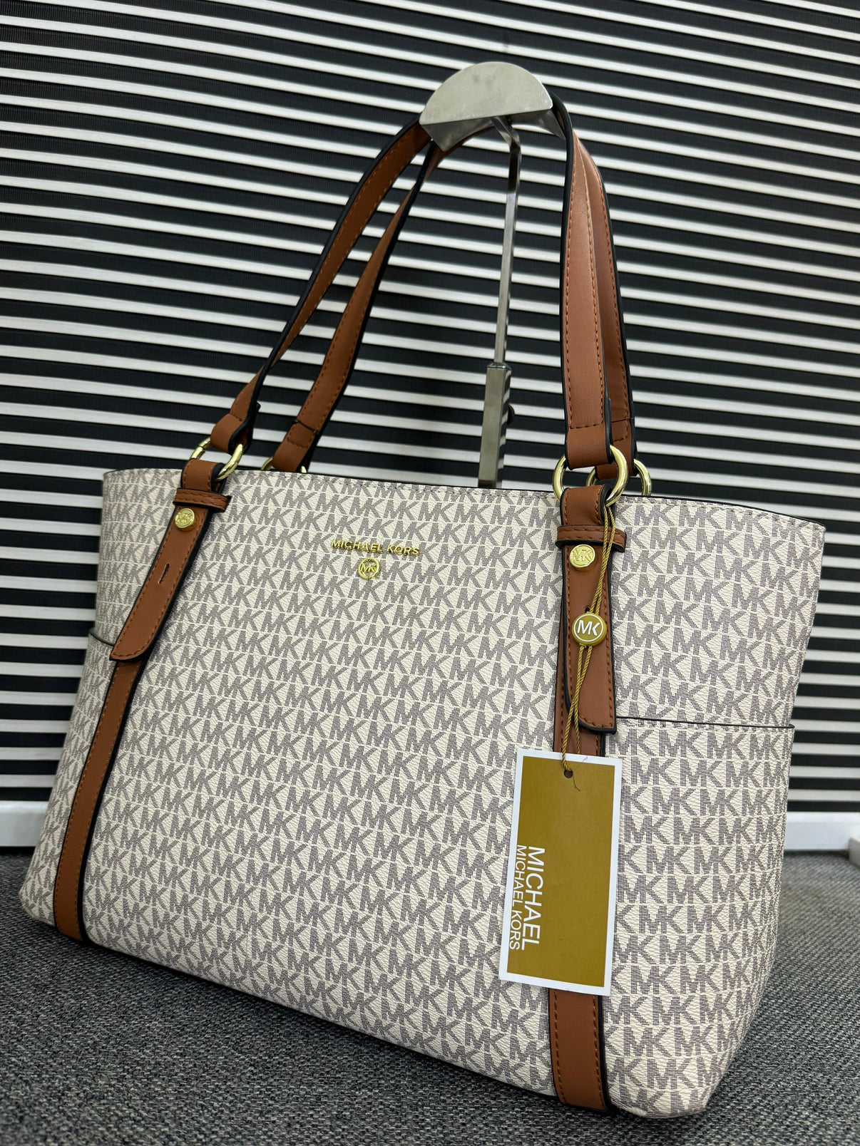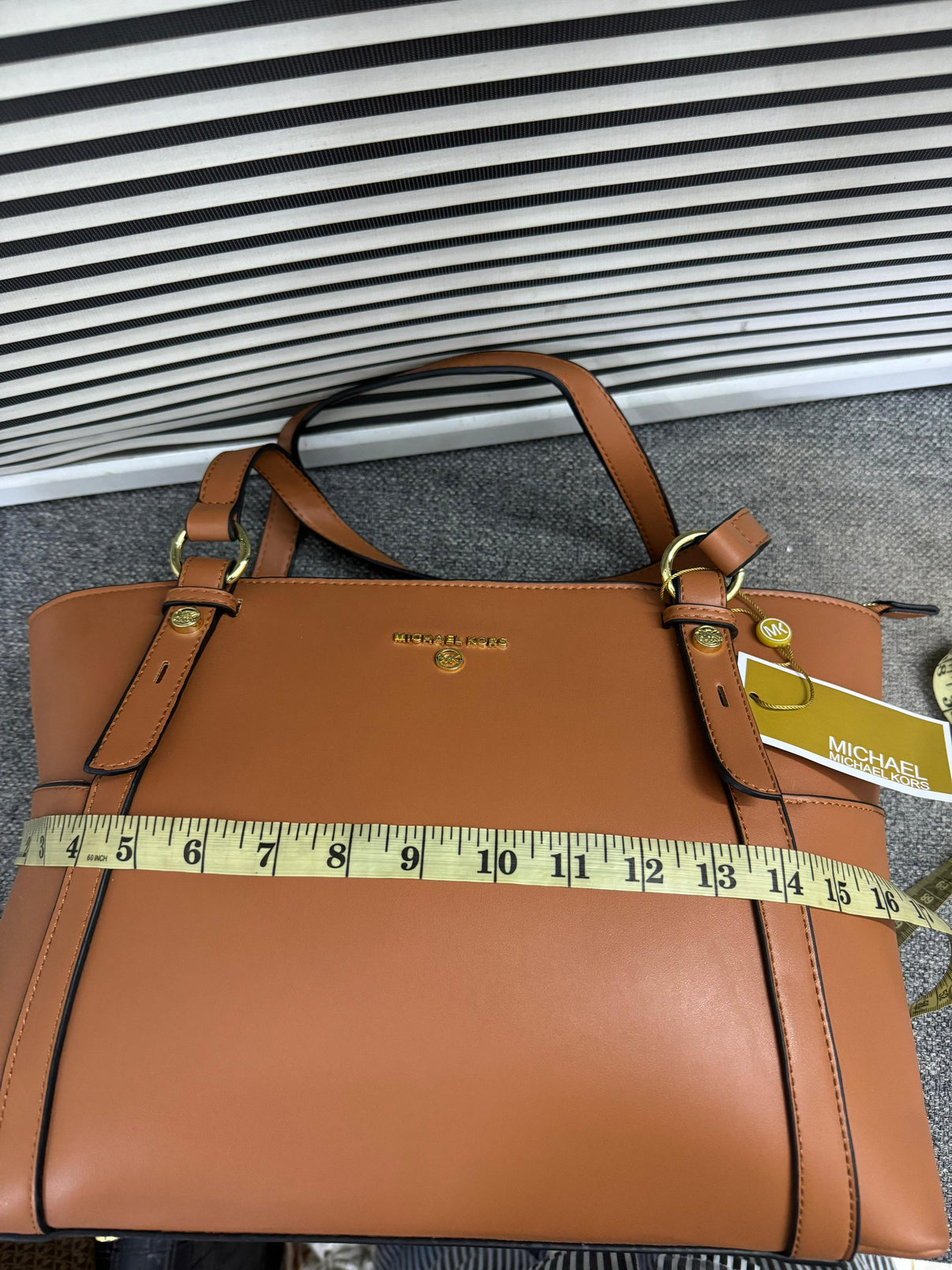 - Style: Sullivan Tote - Material: Premium Saffiano leather for durability and a sleek finish - Size: Spacious interior with multiple compartments, ideal for daily essentials - Top zip closure for security - Dual top handles for easy carrying - Removable and adjustable crossbody strap for versatility - Interior: Includes zip and slip pockets for organized storage - Exterior: Signature MK logo charm and metal hardware for added style - Use: Perfect for work, travel, or everyday use - Dimensions (L x W x H): Approx. 15” x 5” x 11”