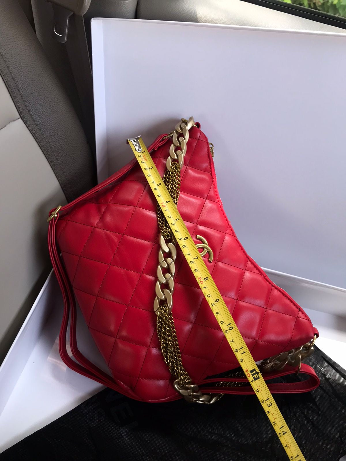 - Strap: Interwoven leather and chain crossbody strap with adjustable length for versatile styling. - Hardware: Signature CC closure and hardware, adding a luxurious touch. - Interior: Lined with durable grosgrain leather; includes a slip pocket and a small zippered pocket for organization. - Closure: top with a secure zip closure. - Branding: Prominent CC logo on the front flap and discreet "Chanel" logo embossed inside. - Versatility: Perfect for evening events, parties, or elevating a casual outfit with a touch of shine and sophistication.