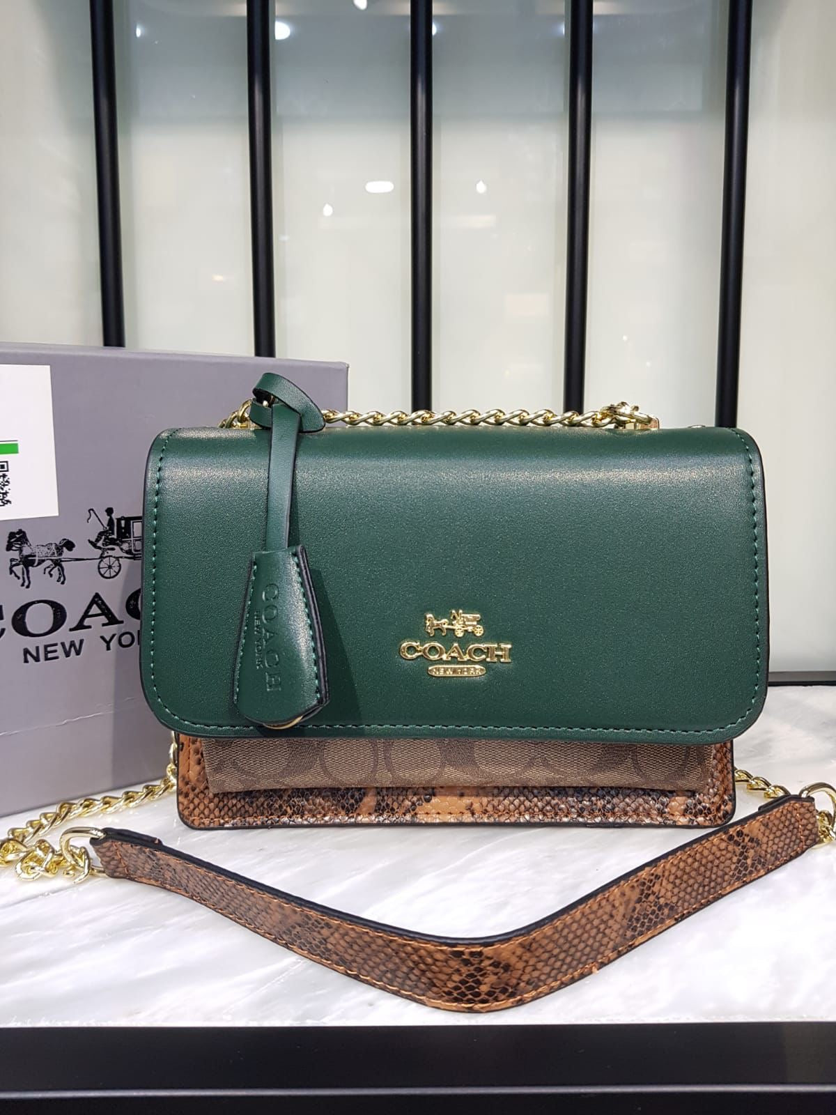 - Size: 21.5 x 15 x 7 cm - Signature Logo on the front - Signature coated canvas and snake-embossed faux leather - Chain strap - Inside zip and multifunction pockets - Flap with magnetic snap closure - Outside slip pocket - Box & Dust bag included