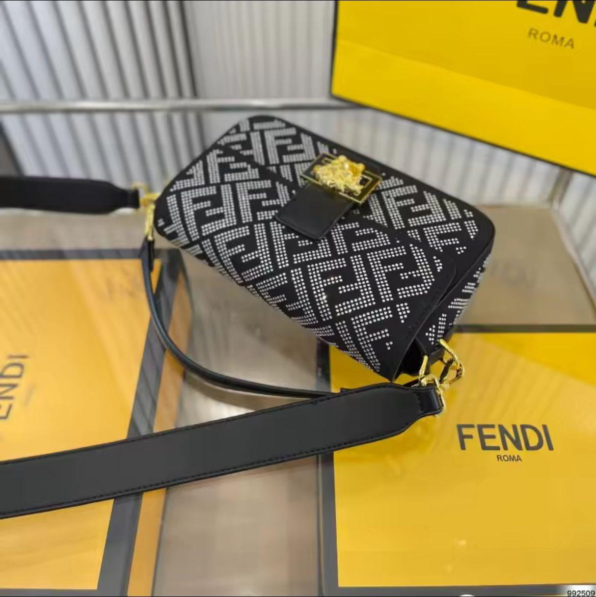 Introducing the epitome of luxury and sophistication: the Fendi X Versace Fendace Baguette Shoulder Bag with Crystal-Embellished details. This exquisite piece features the iconic La Medusa hardware and Fendace FF print, exuding a blend of Fendi and Versace's signature styles. The bag is adorned with sparkling crystal embellishments and secured with a magnetic FF snap button closure. Versatile in design, it can be carried by hand or worn on the shoulder or cross-body using the detachable handle and leather strap. Gold-tone hardware adds a touch of opulence, while the interior boasts a spacious compartment pocket for practicality. Presented in a full box packaging, this shoulder bag is a statement of unparalleled craftsmanship and luxury, perfect for elevating any ensemble with its distinctive allure.