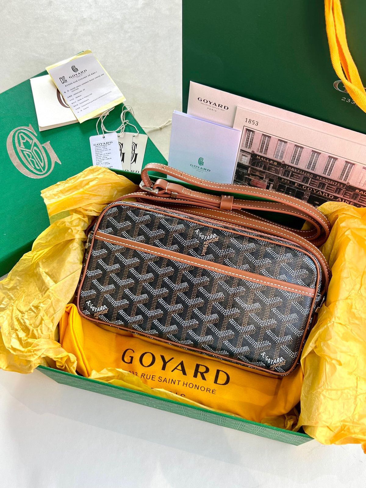 Iconic Goyardine coated canvas body with Goyard’s signature chevron pattern