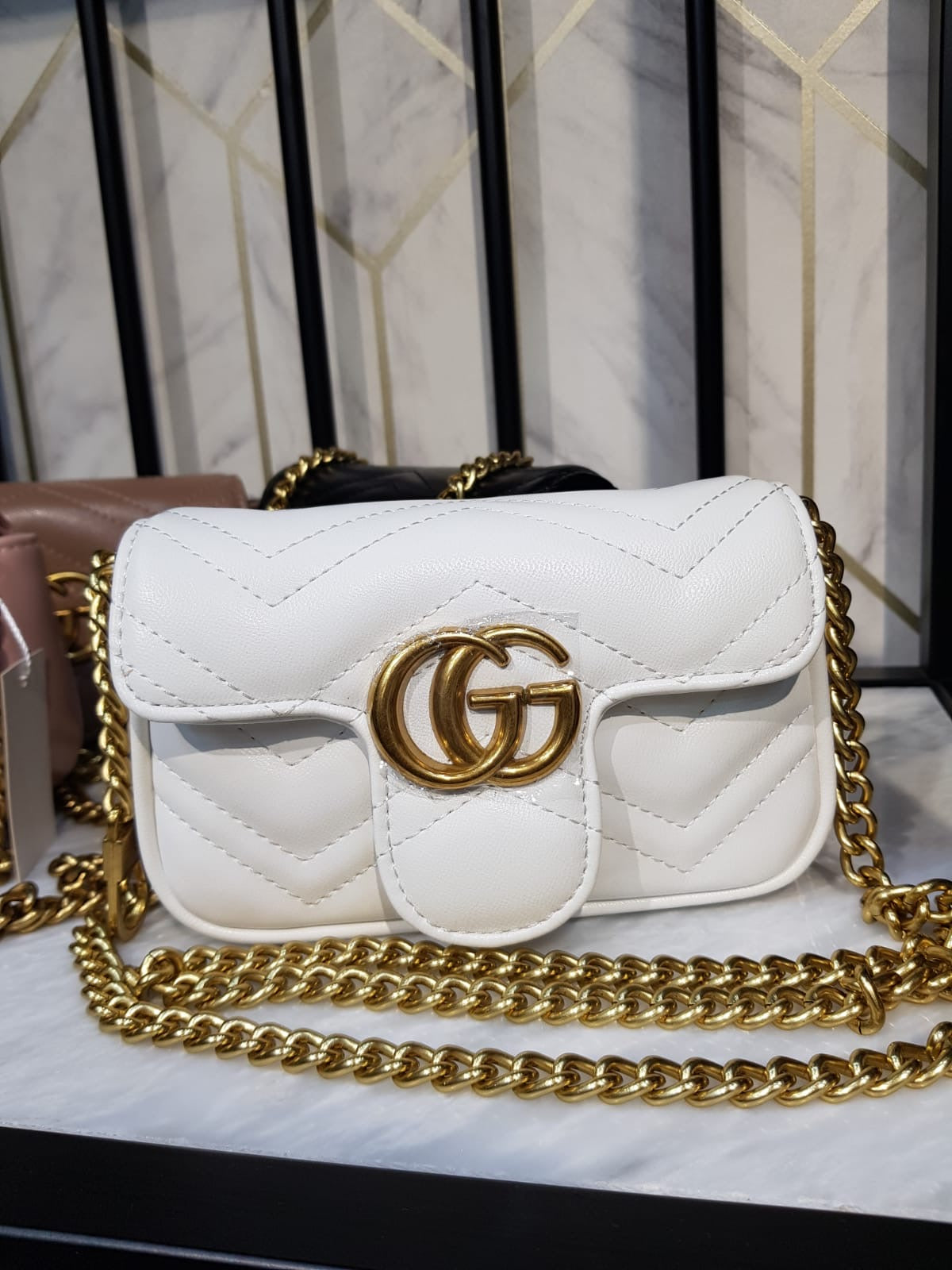 - Dimensions: 17 × 10 × 6 cm - Flap with spring closure - Gold-toned hardware - Attached key ring that can attach to a separate bag - Double G - Chain shoulder strap - Dust bag included