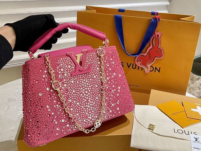 Covered with shimmering crystals, this special edition of the Capucines bag reflects the aquatic theme of the Louis Vuitton's Cruise 2024 fashion show. This exquisitely crafted piece is the perfect compagnon for your most glamorous looks. Like all Capucines bags, it allows a double carry style, with the flap inside or outside.