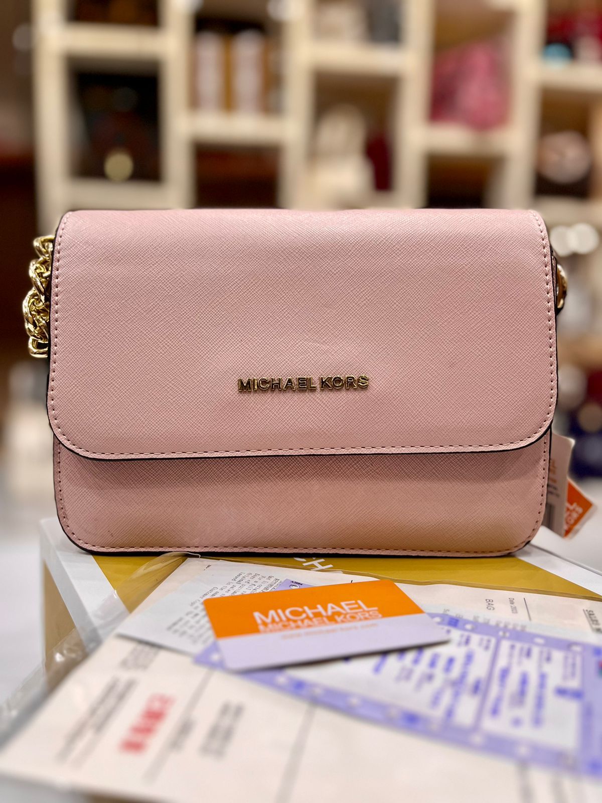 This Michael Kors crossbody bag offers luxurious quality and comes with complete branding and documentation for an authentic touch.