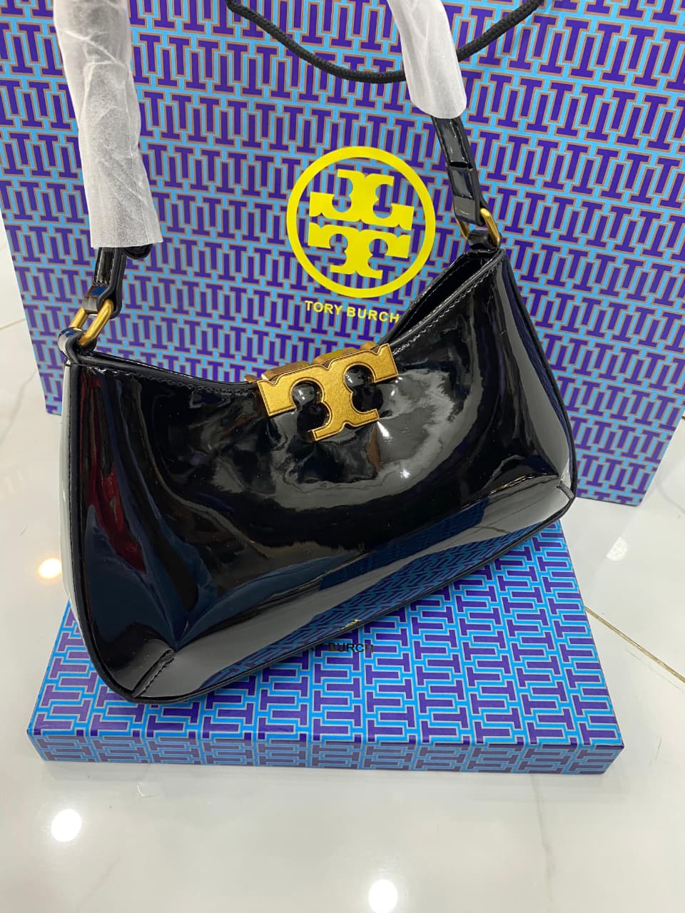 Signature Tory Burch logo hardware for a luxe finish