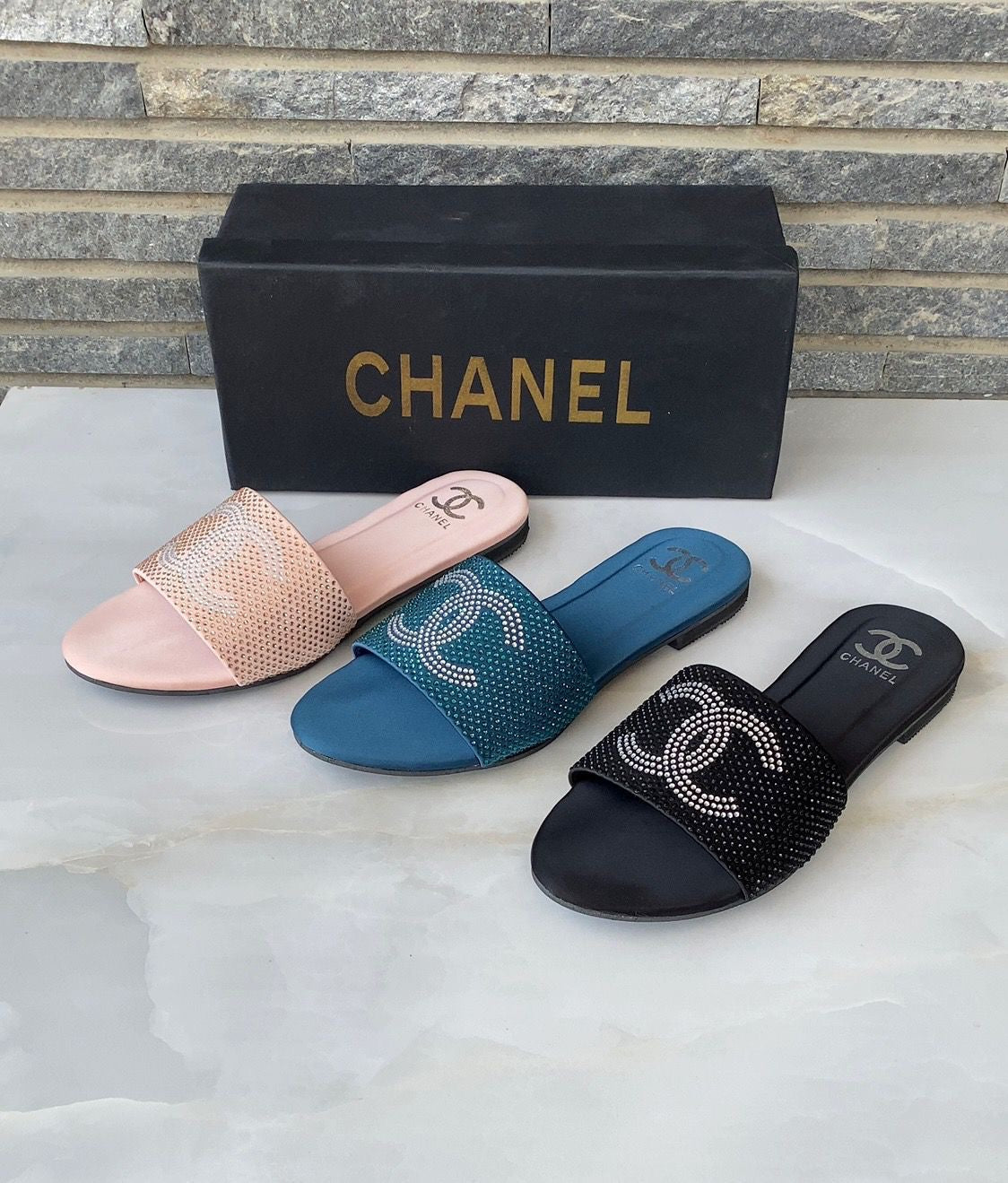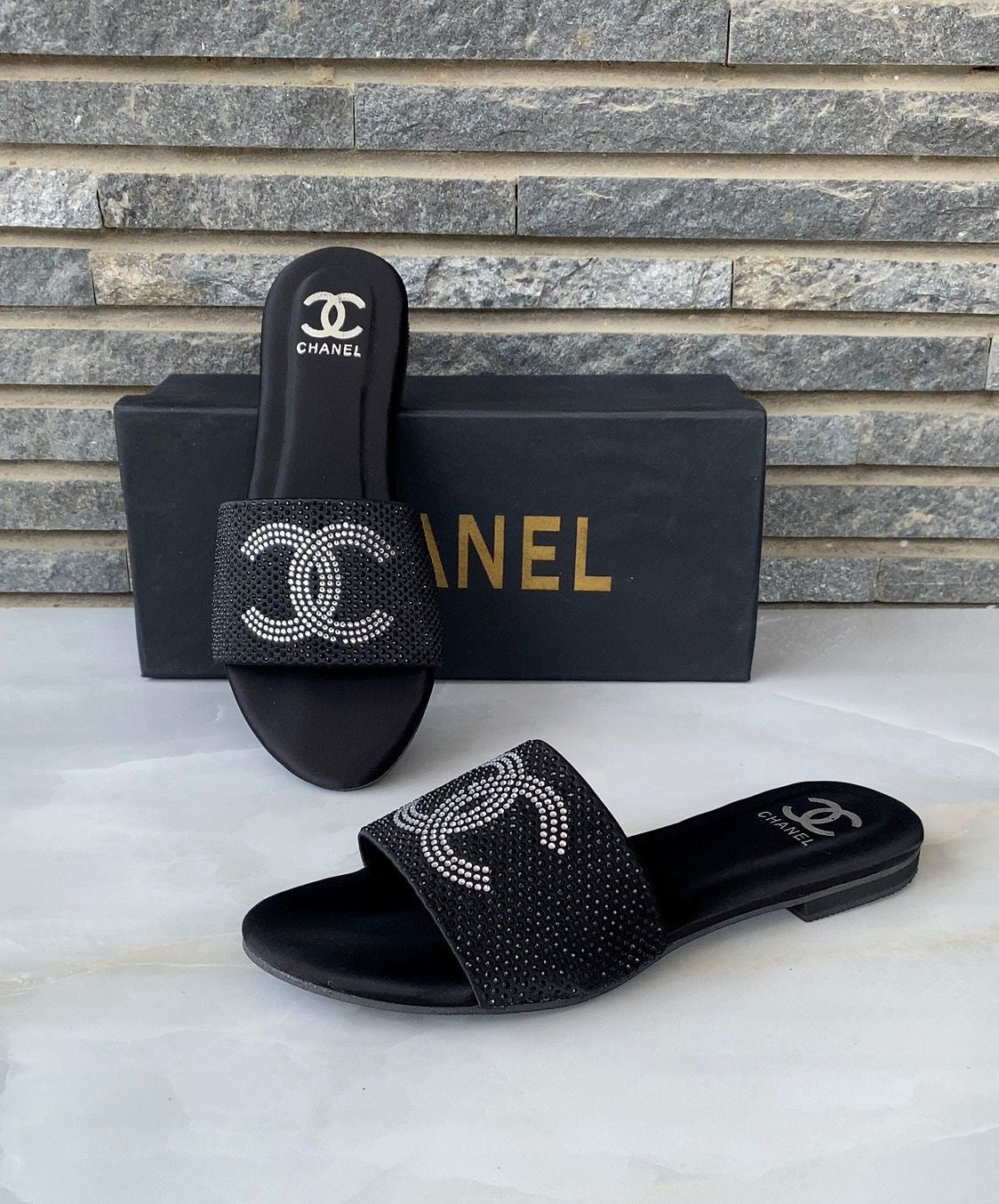 - Material: Crafted from high-quality leather, patent leather, or durable synthetic materials, ensuring both style and longevity. - Heel Style: Available in various options, including flat, low-heel, and wedge designs, to cater to different preferences. - Comfort: Designed with a cushioned footbed and supportive sole for all-day comfort, ideal for long wear. - Branding: Iconic Chanel branding, usually seen in the form of metal logos, embossed details, or logo-printed footbeds. - Versatility: Perfect for casual outings, beachwear, or dressing up a summer outfit, offering effortless chic. - Sole: Sturdy rubber or leather sole for good traction and durability. - Fit: True to size, with a variety of sizes available to accommodate different foot shapes.
