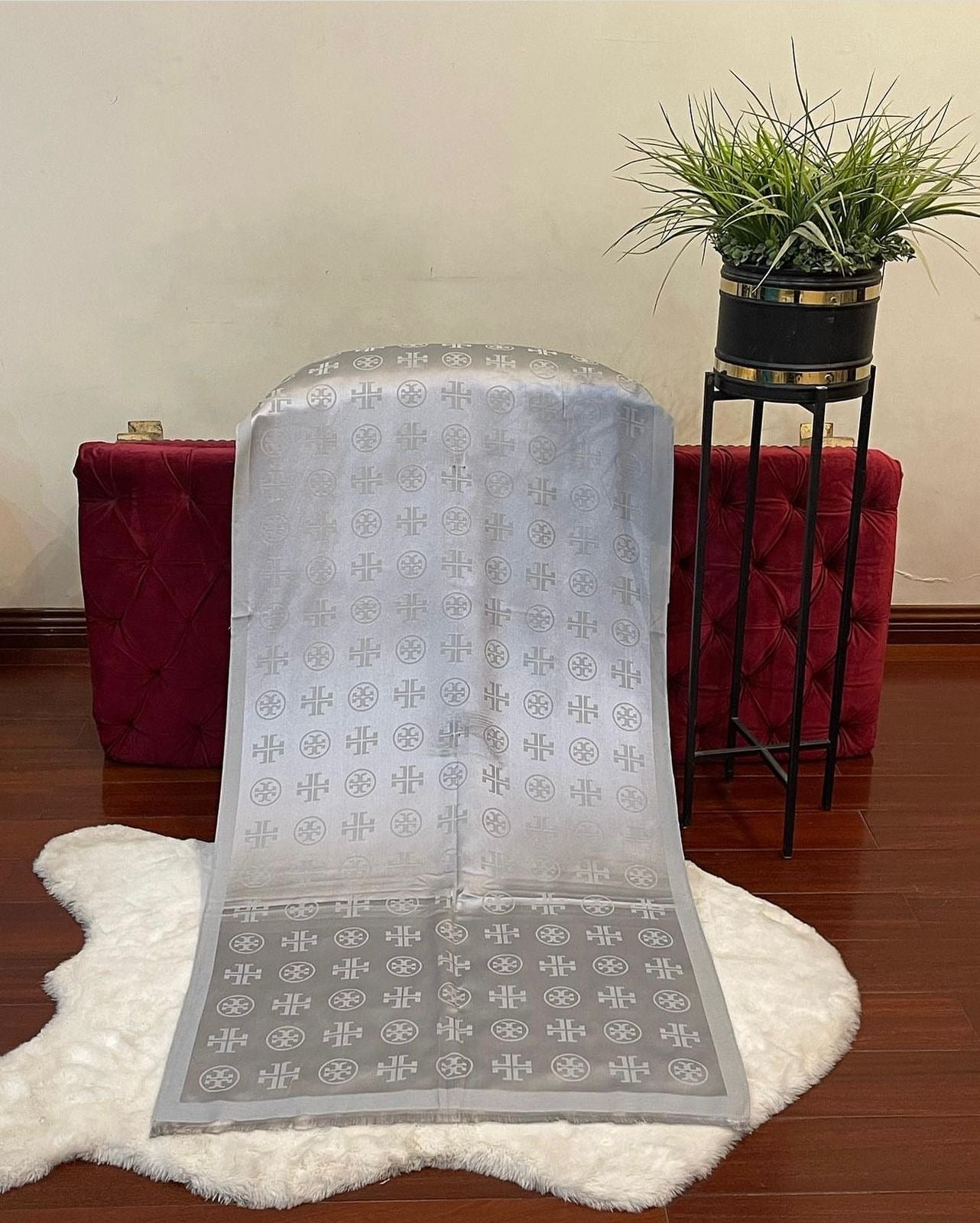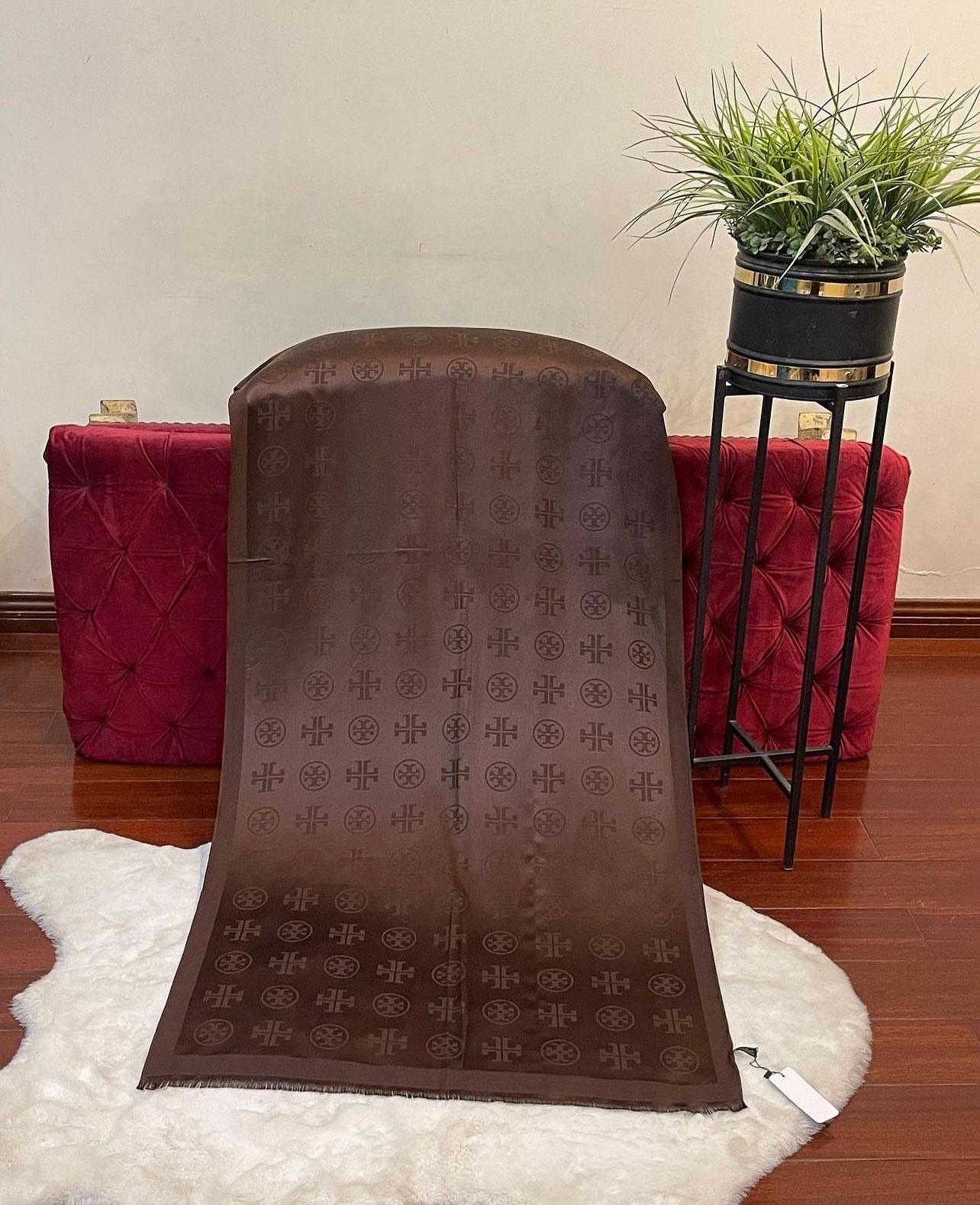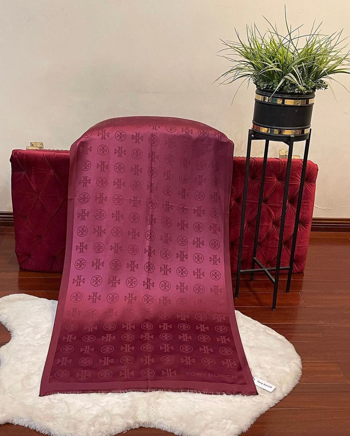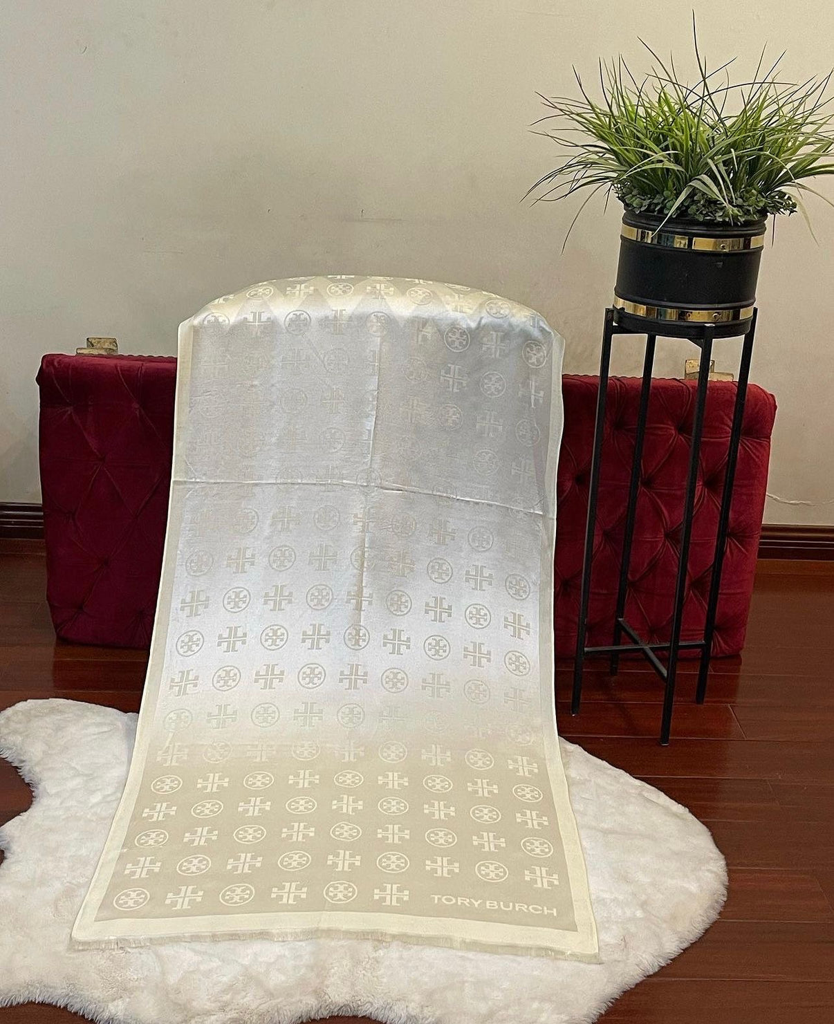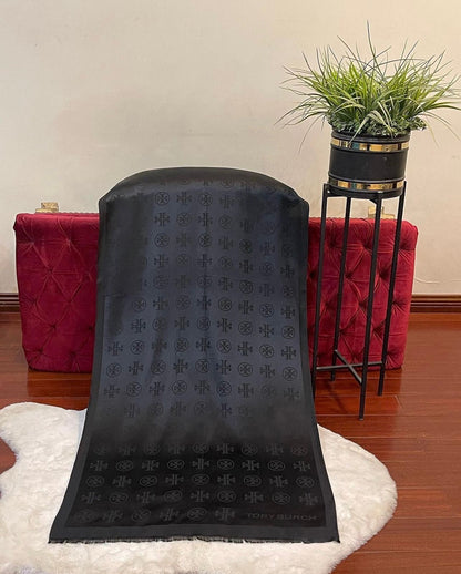 Material: Luxurious blend of fine silk and pashmina. Design: Elegant and timeless design, often featuring intricate patterns or the iconic Tory Burch monogram. - Size: 70 by 35 inch - Color Options: Available in various classic and seasonal colors, catering to different tastes. - Branding: Subtle yet sophisticated Tory Burch branding, typically woven or embroidered into the fabric. - Texture: Soft and lightweight, offering both comfort and warmth. - Versatility: Suitable for both casual and formal wear, easily enhancing any outfit.