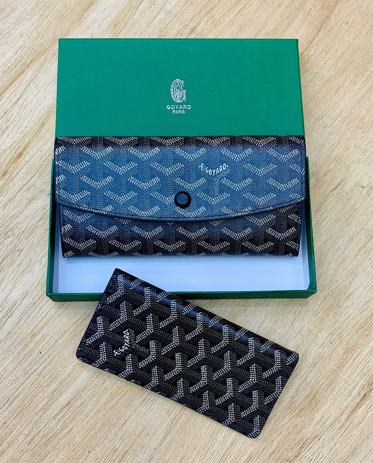 Signature Goyardine canvas with hand-painted chevron pattern